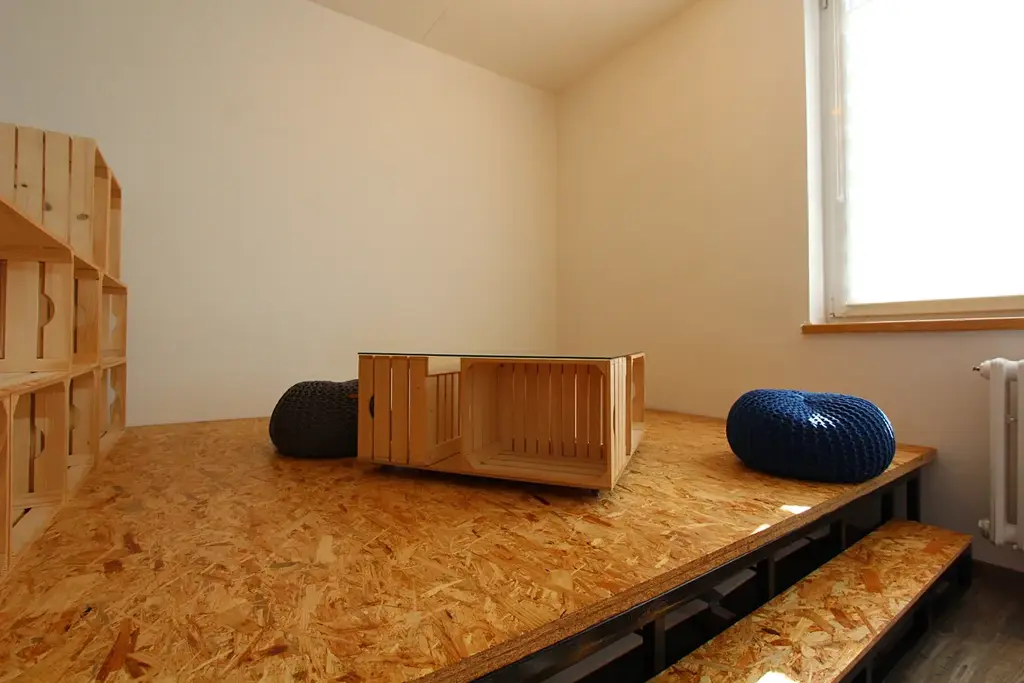 Obývací část je vybavena podiem, výsuvná část podia slouží ke spaní.