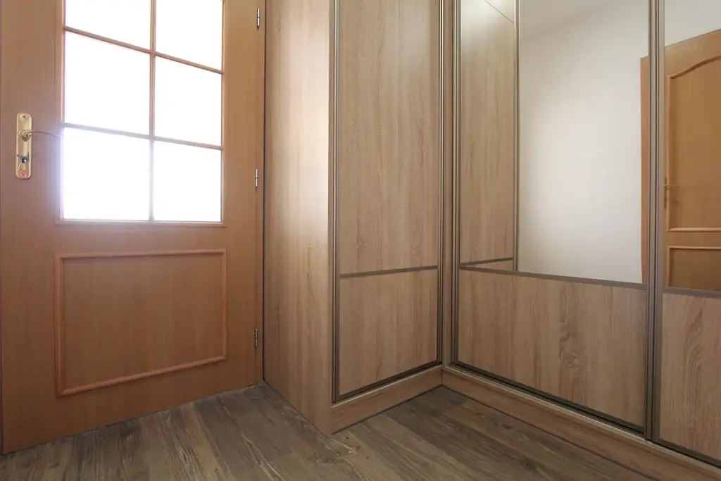 V prostorné předsíni jsou k dispozici na míru zhotovené vestavěné skříně.