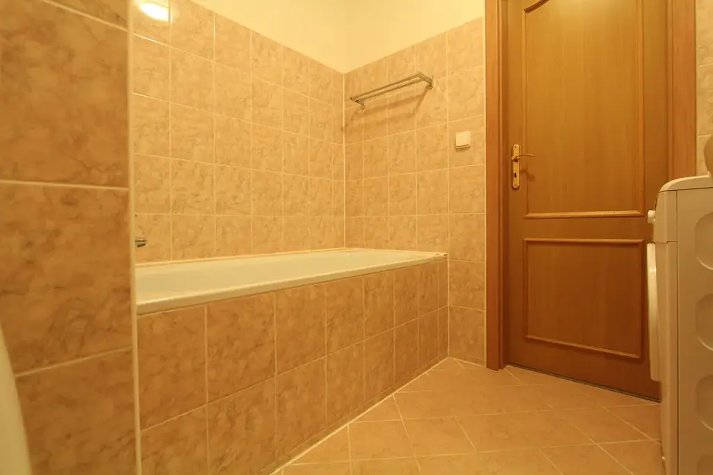 V koupelně je vana, umyvadlo, toaleta a pračka.