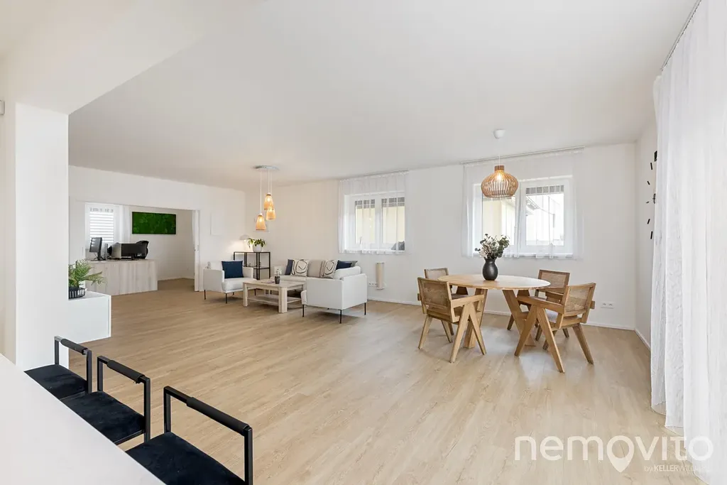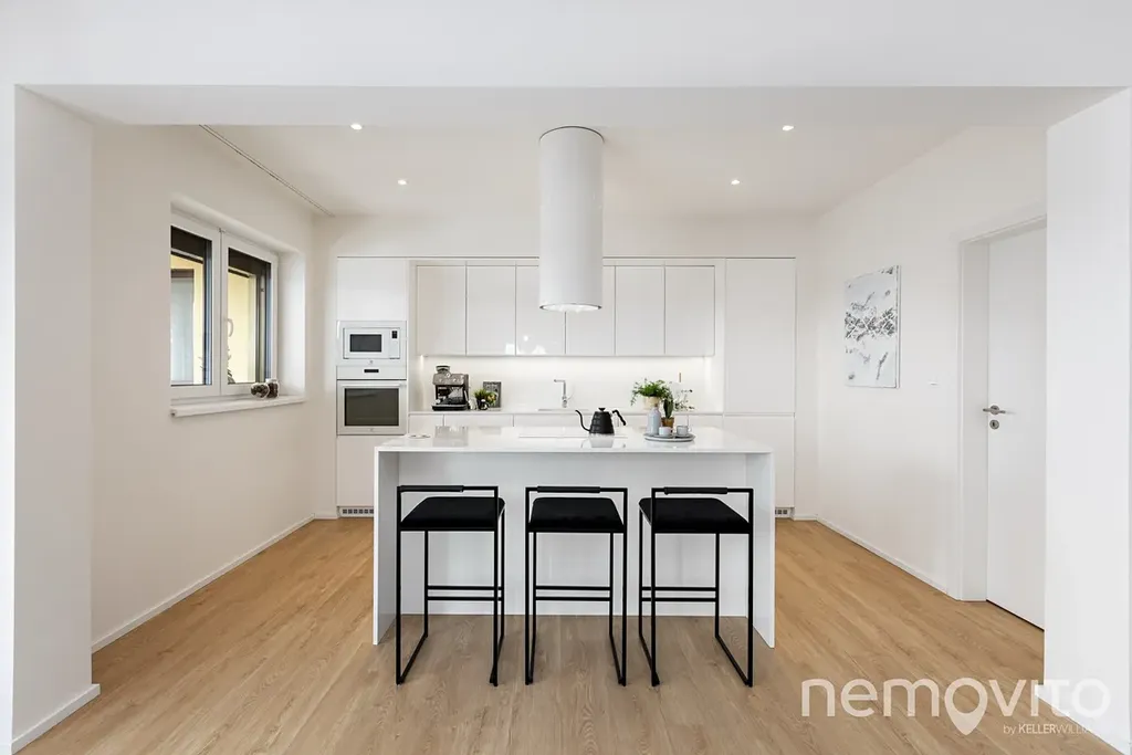 Obývací pokoj s kuchyňským koutem má nadstandardní velikost 55 m2. Ke kuchyni patří ještě velká komora (8 m2) a na obývák navazuje oddělená část, která funguje jako 15 m2 pracovna. Skutečně velkorysé pojetí, kde je na všechno dost místa, ale při zachování nízkých provozních nákladů. Interiér je laděn do světlých a jemných tónů a je klimatizován.