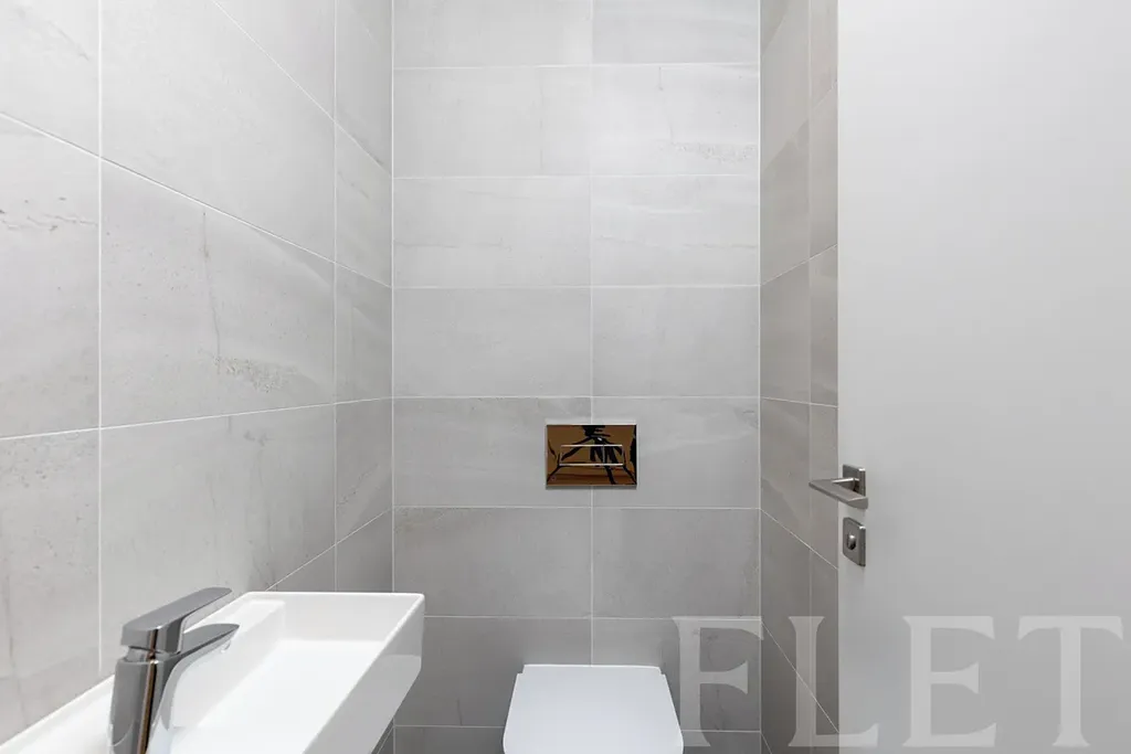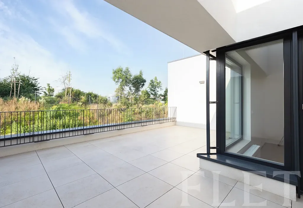 Dům je rozdělen na technickou část s garáží pro dvě auta, společenskou část a klidovou obytnou zónu. Ve všech pokojích je položena kvalitní dřevěná podlaha, která podtrhuje celkový elegantní dojem. Srdcem domu je prostorná a moderní kuchyně značky Hanák s ostrůvkem, plně vybavená pro každodenní vaření i setkávání s rodinou či přáteli. Na ni navazuje obývací část s přímým vstupem na zahradu, která nabízí dostatek prostoru pro venkovní posezení, pěstování bylinek nebo třeba menší bazének pro letní osvěžení. Díky automatické závlaze je péče o zahradu téměř bez starostí. V obytné části se nachází dva pokoje, z nichž jeden může sloužit jako ložnice s přímým vstupem na terasu. Dům disponuje dvěma koupelnami – ve společenské části najdete sprchový kout, zatímco v obytné části si můžete dopřát relaxační koupel ve vaně. Velká okna a francouzské dveře zajišťují dostatek denního světla, zatímco klimatizace ve všech pokojích garantuje příjemné klima i během horkých letních dnů.