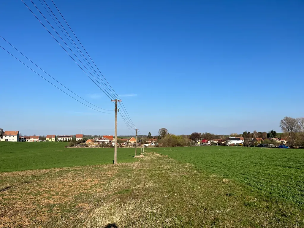 Příjezdová asfaltová cesta cca 40 m od pozemku, kde jsou kompletní inženýrské sítě: vodovod, hloubková kanalizace, plyn, veřejné osvětlení + přes pozemek vede vedení el. nízkého napětí. Příjezd k našemu pozemku je umožněn po sjezdu s asfaltové silnice přes obecní travnatý pozemek s možností úpravy na zpevněnou cestu i pro vedení ing. sítí po dohodě s obcí a zpracování v projektu.