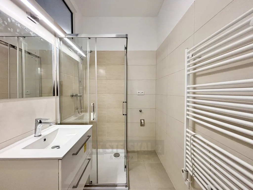 Dispozice bytu zahrnuje vybavenou kuchyň, prostorný obytný pokoj a koupelnu se sprchovým koutem a WC. V rámci rekonstrukce byly provedeny nové rozvody, podlahy, koupelna i kuchyňská linka. Byt působí velmi příjemně a nabízí komfortní bydlení.