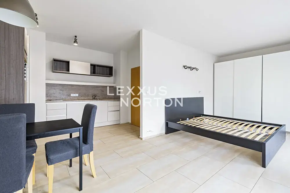 Tento byt 1+kk k pronájmu dispozičně nabízí k užívání vstupní chodbu, obývací prostor společně s plně vybaveným kuchyňským koutem s jídelní a ložnicovou částí a 1 koupelnu. K nemovitosti náleží terasa o velikosti 20 m2.