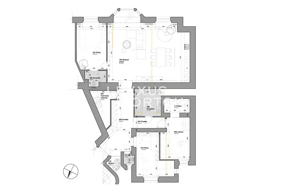 Dominantou bytu je velkorysý obytný prostor s kuchyňským koutem, orientovaný na jih až jihozápad směrem do zeleně Puškinova náměstí. Díky arkýři a velkým oknům je interiér přirozeně prosvětlený a nabízí příjemnou atmosféru městského bydlení.