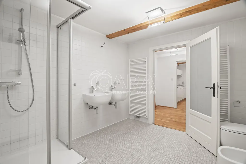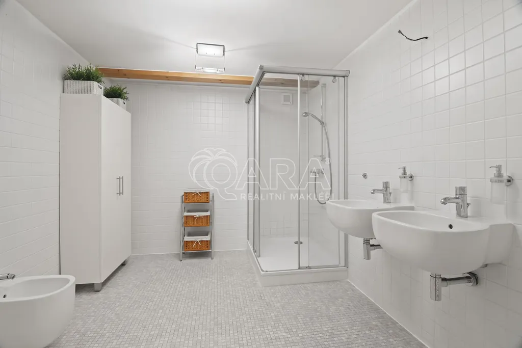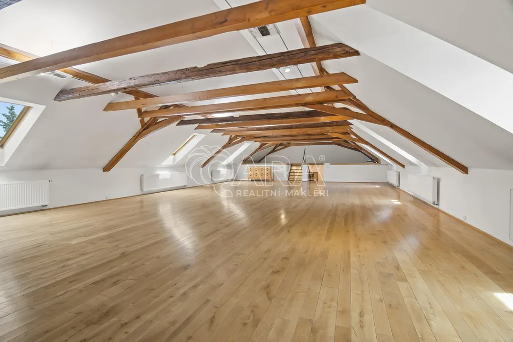 Celková podlahová plocha činí 469,5 m and sup2; ve dvou podlažích. Přízemí o velikosti 221 m and sup2; je řešeno jako skladový prostor s možností přímého vjezdu, zatímco horní podlaží o výměře 248,5 m and sup2; tvoří otevřený a reprezentativní prostor vhodný pro showroom, kanceláře nebo ateliér. Díky konstrukčnímu řešení krovu bez podpěrných sloupů je prostor maximálně variabilní a vzdušný.