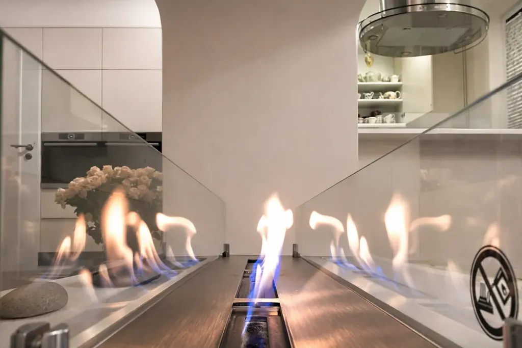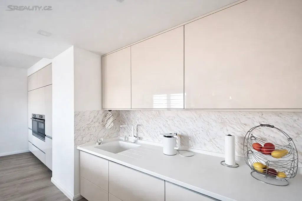 Byt je vybaven designovou kuchyňskou linkou na míru s vestavěnými spotřebiči Bosch, kuchyňským ostrůvkem a rozkládacím jídelním stolem.