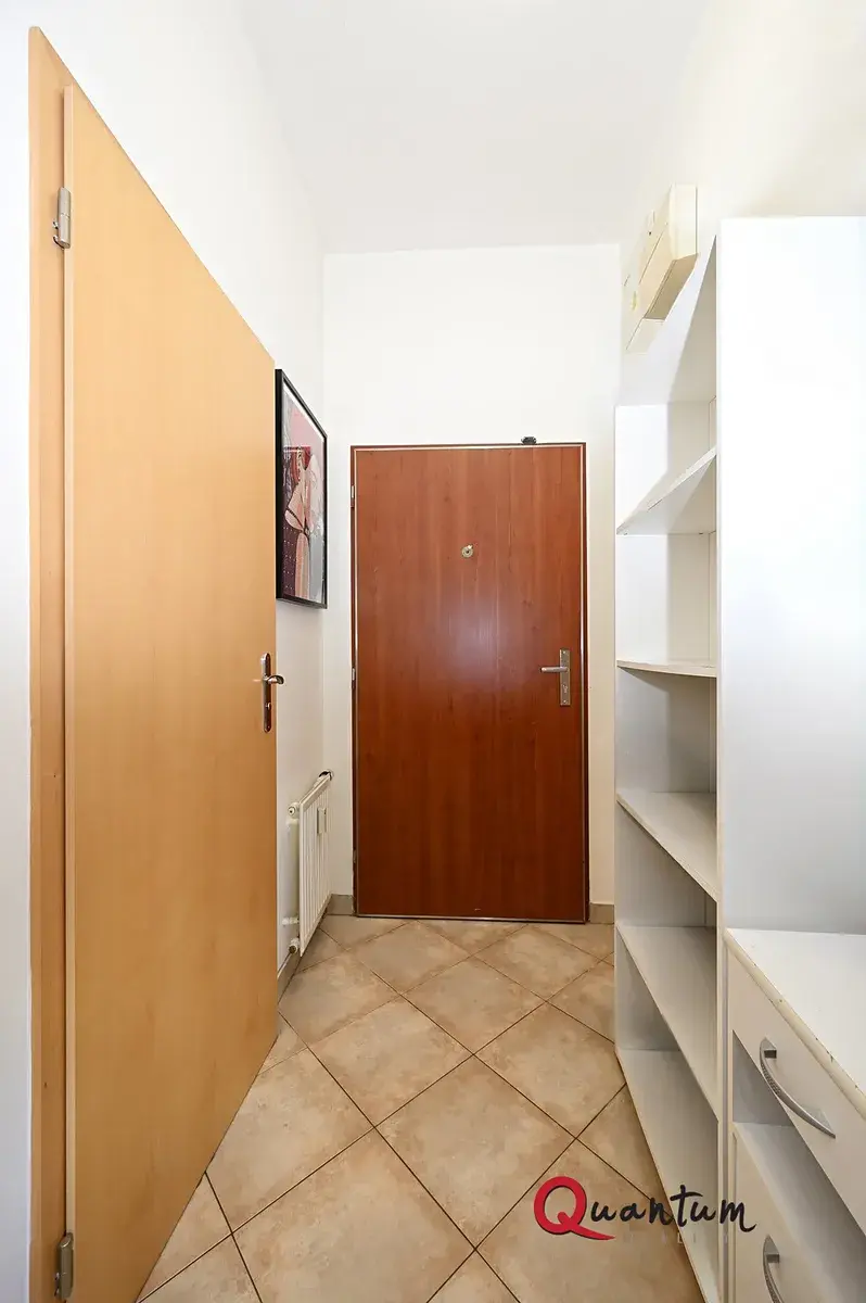 Jednotka o dispozici 1+kk se skládá z předsíně, koupelny s vanou a toaletou a hlavní obytné místnosti s kuchyňským koutem (včetně malé lednice). Součástí je také praktická šatna, kterou lze využít jako komoru nebo menší ložnici. Byt se nabízí nezařízený.