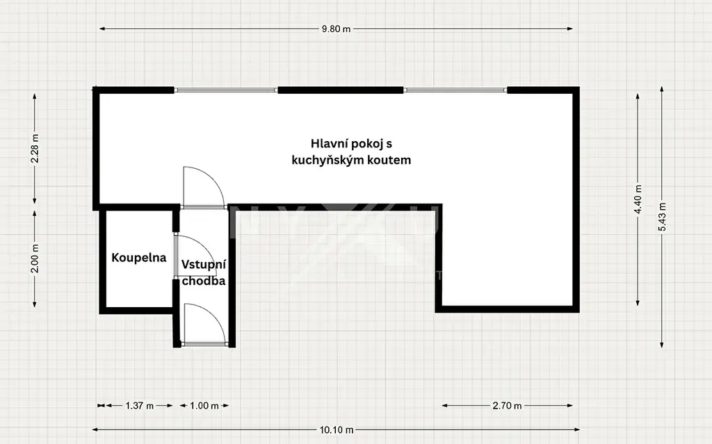 Byt je tvořen vstupní chodbou, koupelnou se sprchovým koutem a hlavním pokojem s kuchyňským koutem.