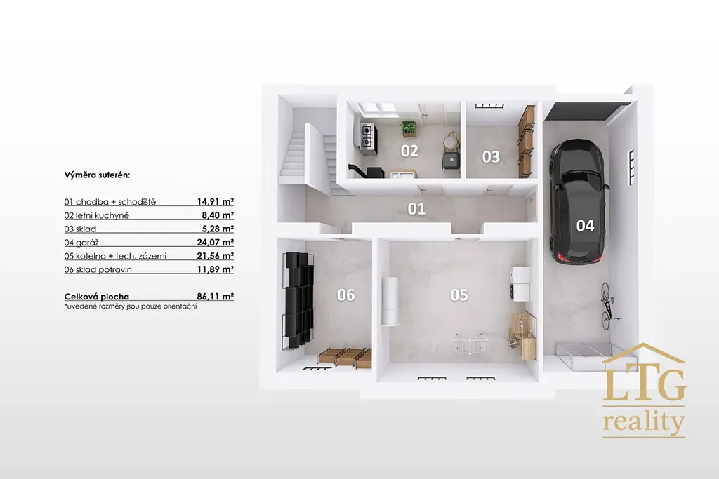 Podzemní podlaží (cca 86 m²) tvoří technické a provozní zázemí – garáž, letní kuchyně se vstupem na zahradu, technická místnost a dva skladové prostory. Praktická část domu, která má jasné využití i do budoucna.