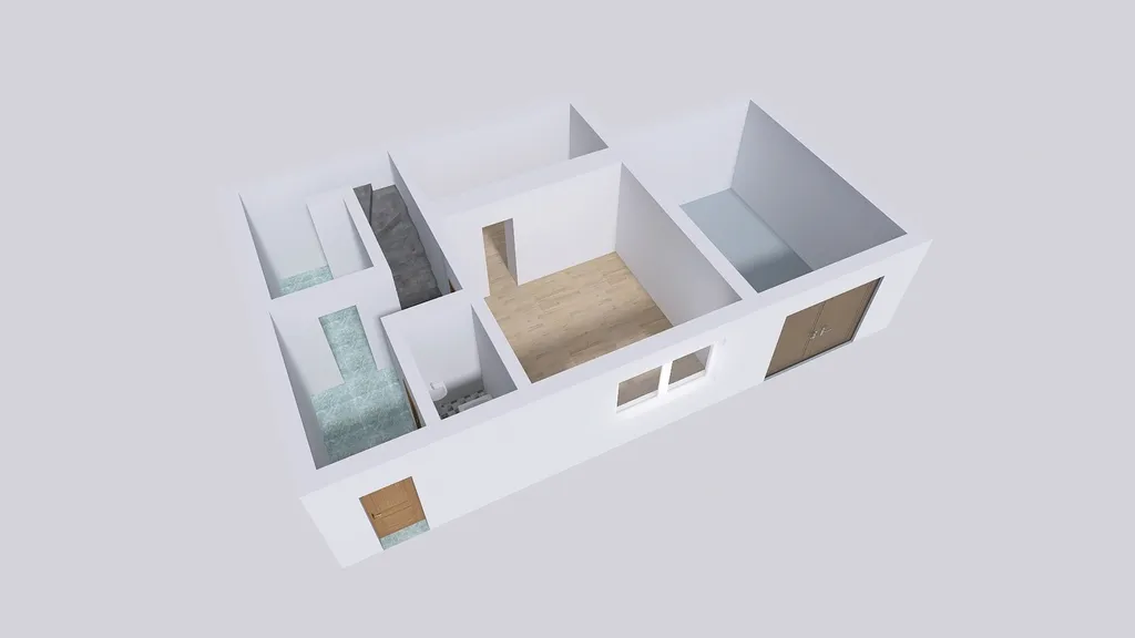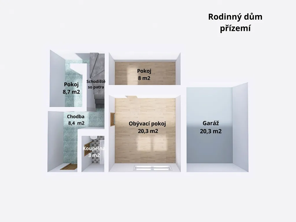 -Přízemí: obývací pokoj, místnost vhodná jako šatna, chodba, koupelna.