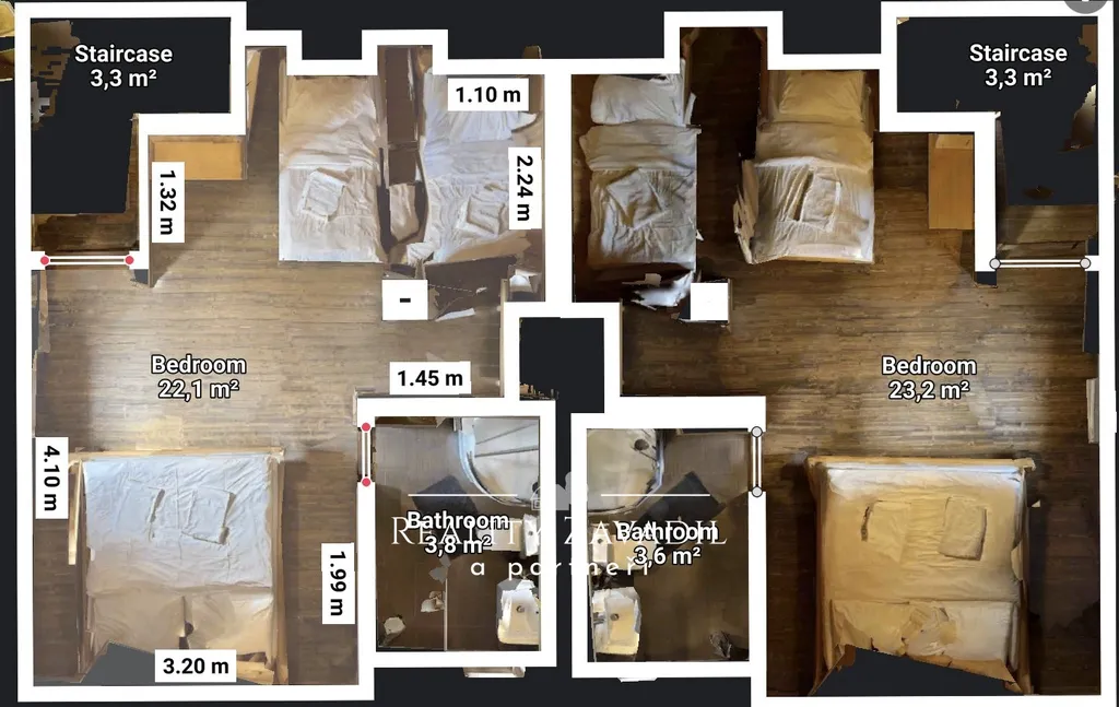 - **Patro**: Ložnice s manželskou postelí a jednolůžkem, koupelna se sprchovým koutem a toaletou.