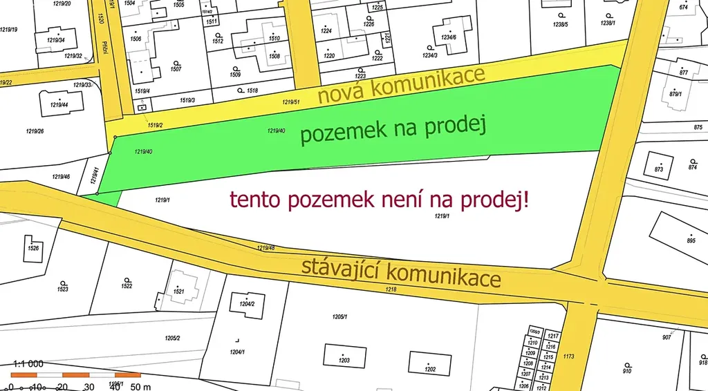 - z pozemku není nutné oddělovat plochu pro komunikaci, na severu celý prodávaný pozemek lemuje pozemek obce, na kterém je možné komunikaci umístit