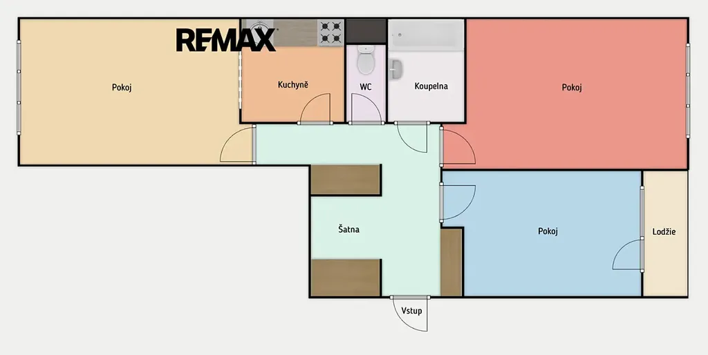 Z domovní chodby se vchází do předsíně bytu, která má praktické vestavěné skříně a samostatné vstupy do všech tří pokojů a kuchyně. Z předsíně - chodby bytu se rovněž vstupuje do koupelny s vanou a umyvadlem a na samostatné WC.