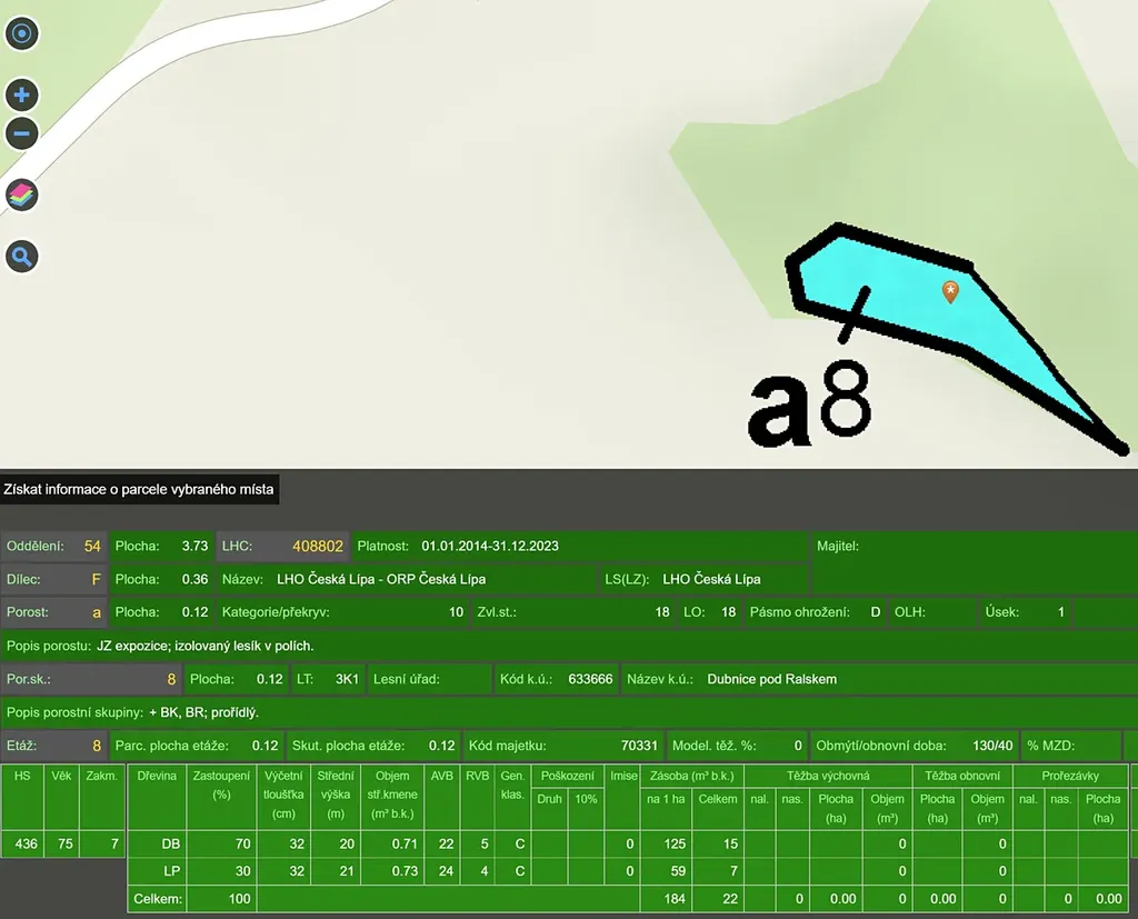 V lese dub 70%, lípa 30%, stáří 83 let