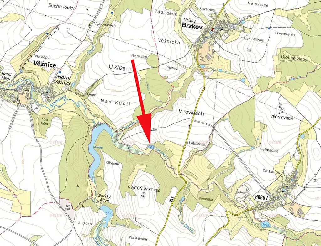 Prodáme louku s několika stromy (možno těžit) v k.ú. Brzkov, parcela č. 2378. Jižní cíp louky sousedí s místní vodotečí (Skrýšovický potok)
