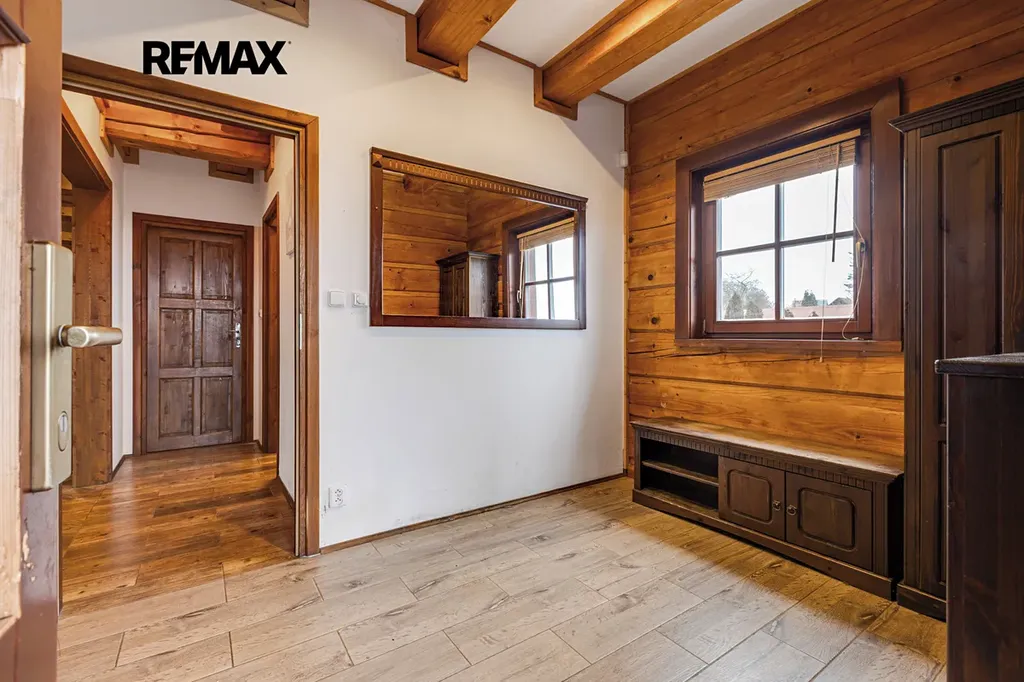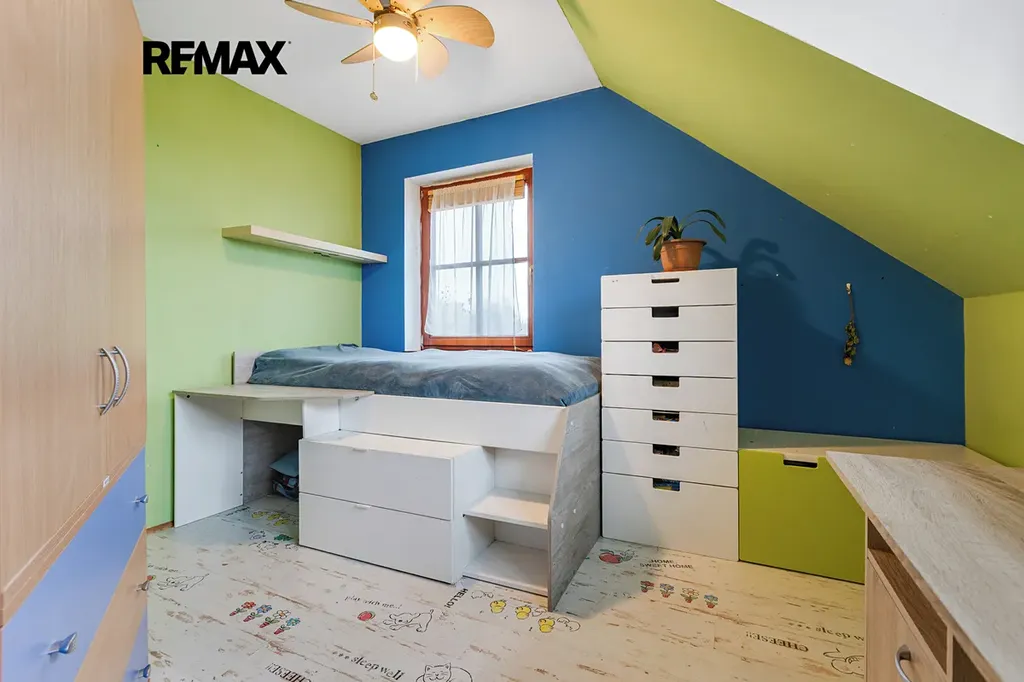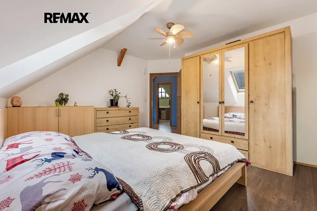 V patře je ložnice, dva samostatné pokoje a prostorná koupelna s toaletou.