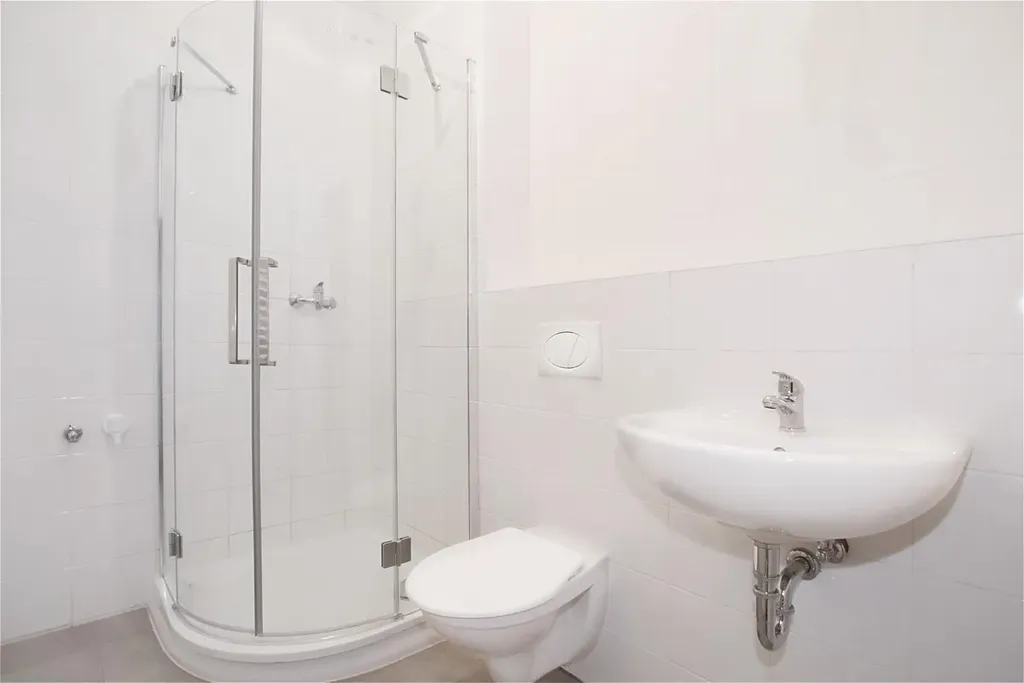 Rozložení bytu. Z předsíně (4 m2) vstup do obývacího pokoje (25 m2), kde je součástí moderní kuchyňská linka. Vybavení kuchyně: elektrická trouba, sklokeramická varná deska a digestoř. Koupelna (5 m2) byla osazena sprchovým koutem, keramickým umyvadlem a WC.