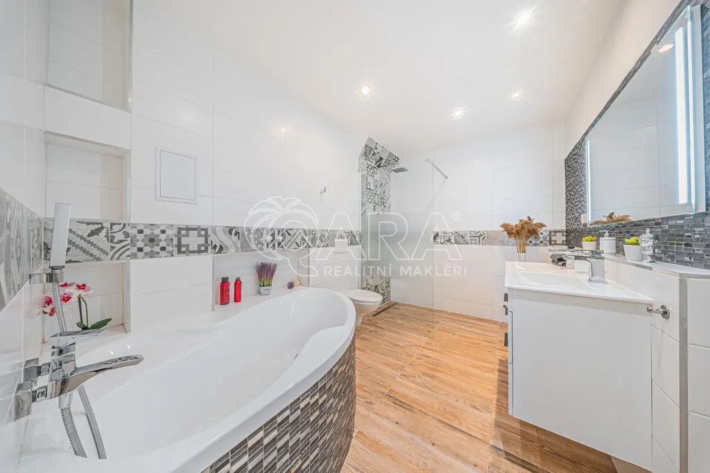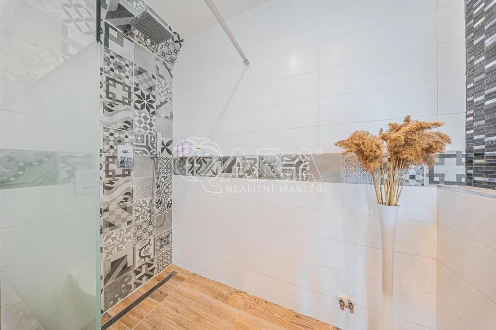 Byt zaujme také množstvím praktických úložných prostor, které u podobných dispozic nebývají běžné. K dispozici jsou vestavěné skříně v chodbě, samostatná prádelna, komora i další úložný prostor, takže je dostatek místa nejen pro každodenní fungování domácnosti, ale i pro sportovní vybavení nebo drobnou dílnu.