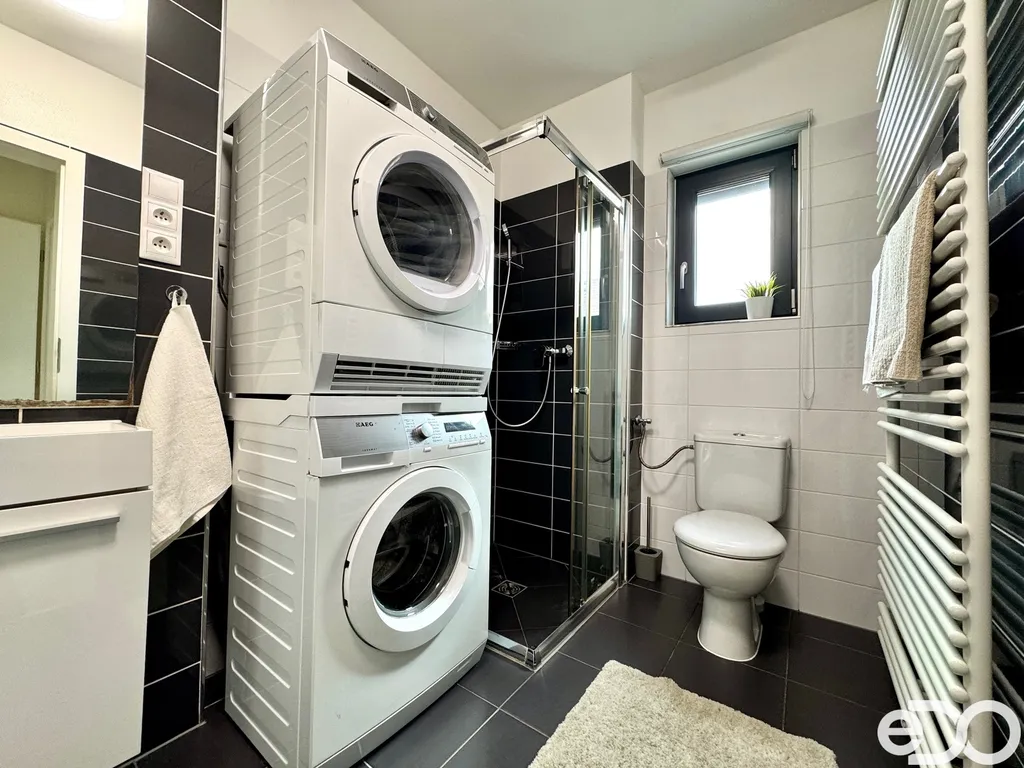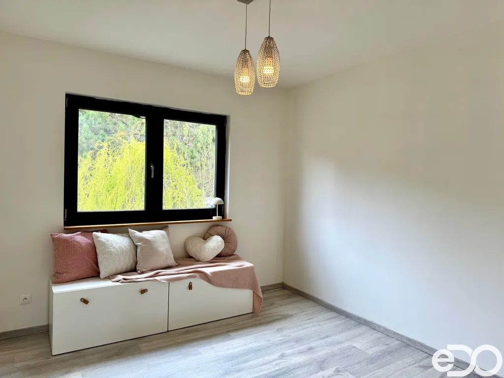 Dominantou nemovitosti je prostorný obývací pokoj s kuchyňským koutem a přímým vstupem na velkou terasu, která navazuje na udržovanou zahradu. Ta poskytuje dostatek soukromí, nachází se zde okrasné jezírko i zázemí pro děti. Údržba zahrady je nenáročná – stačí pravidelné sekání trávy, o začátek a konec sezóny i průběžnou péči se stará majitel.
