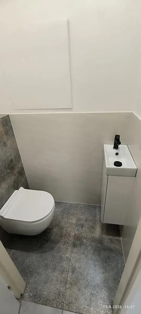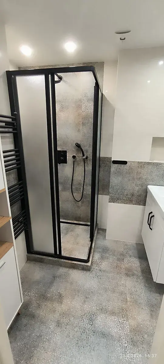 V rámci rekonstrukce byla zvětšena koupelna (ytong) s obklady a dlažbou, které k sobě ladí, nová sanita designový sprchový kout, skříňka s umyvadlem, a skříň na kosmetiku.