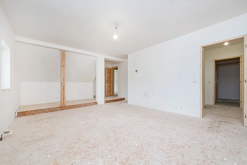 2 NP – dva dokončené samostatné pokoje (2 m2, 40 m2), ve kterých zabývá položit pouze finální povrch podlah, samostatná kuchyňka (6 m2) a koupelna s toaletou, a další prostor ve fázi přípravy (příprava pro další pokoje 13 m2, 44 m2), druhou samostatnou kuchyňku, a dvě samostatné koupelny. Celkem 2NP i s příslušenstvím 175 m2 obytné plochy. Nedokončená část umožňuje případné dispoziční změny dle nového majitele (více pokojů nebo naopak vytvoření většího společného prostoru se vstupem přímo do svahu na zahradu).