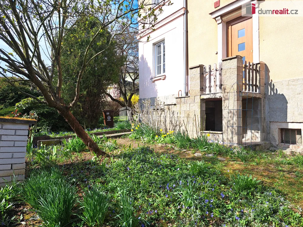 Okolo celého domu je rovinatá, slunná zahrada se vzrostlými stromy.
