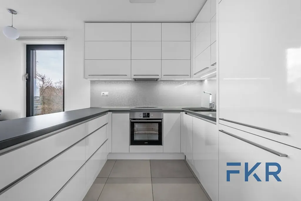 Hlavní obytná část s prostorným balkonem a otevřeným výhledem je navržena jako denní prostor s navazující kuchyní. Velkoformátová okna zajišťují dostatek přirozeného světla. Moderní kuchyňská linka nabízí velkorysé pracovní i úložné zázemí a zároveň přirozeně odděluje kuchyň od obytné části (myčka, lednice, indukce, vinotéka, digestoř).