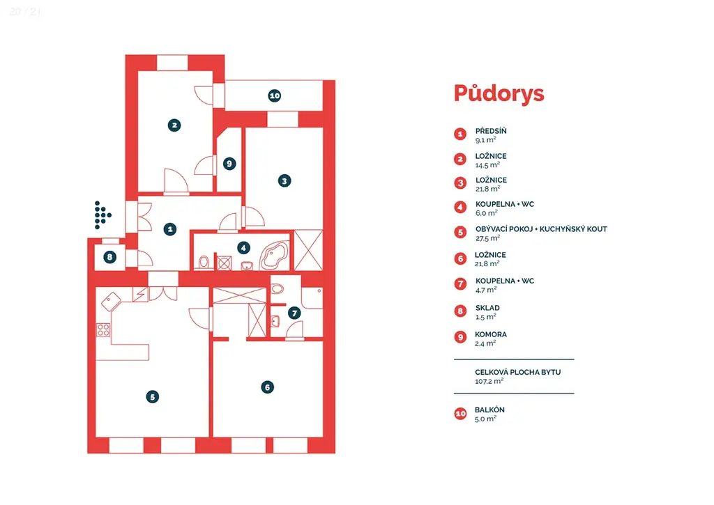 Nabízím k pronájmu nádherný a velmi prostorný byt o dispozici 4+kk (+komora v bytě) a balkon do vnitrobloku a podlahové ploše 107 m² byt a 5 m² balkon, který se nachází ve 4. nadzemním podlaží cihlového domu po rekonstrukci.