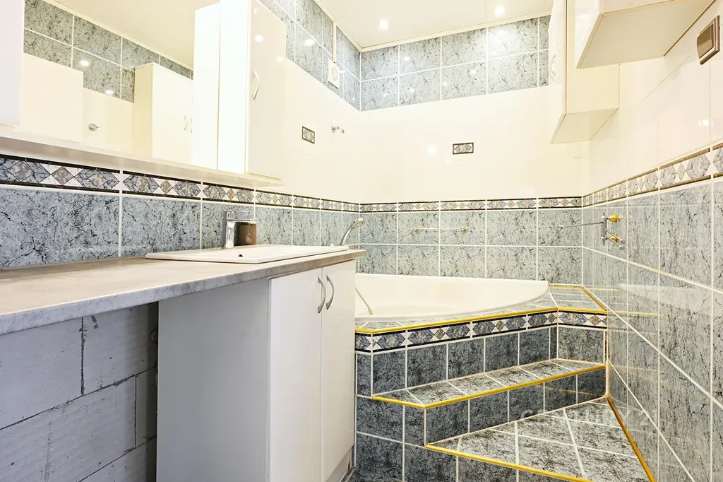 Koupelna s rohovou vanou: Moderně obložená koupelna v modrobílých tónech s prostornou vanou. Přiložená vizualizace ukazuje i potenciál pro případnou úpravu se sprchovým koutem.