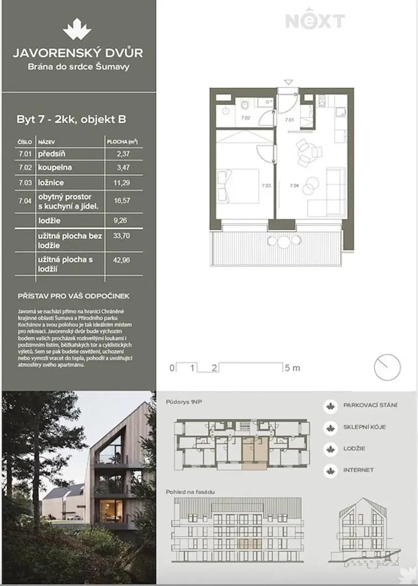 Nabízíme apartmán 2+kk o celkové ploše 35 m² s lodžií 9,28 m² a krásným výhledem do přírody. Součástí ceny je sklepní kóje (2,2 m²) a venkovní parkovací stání.