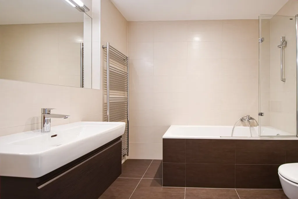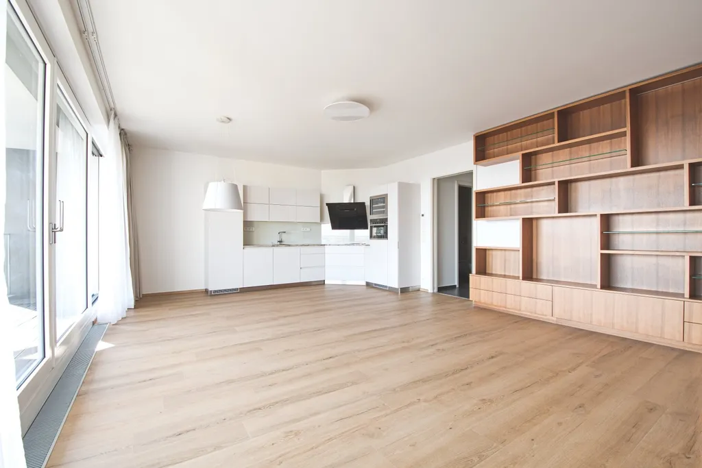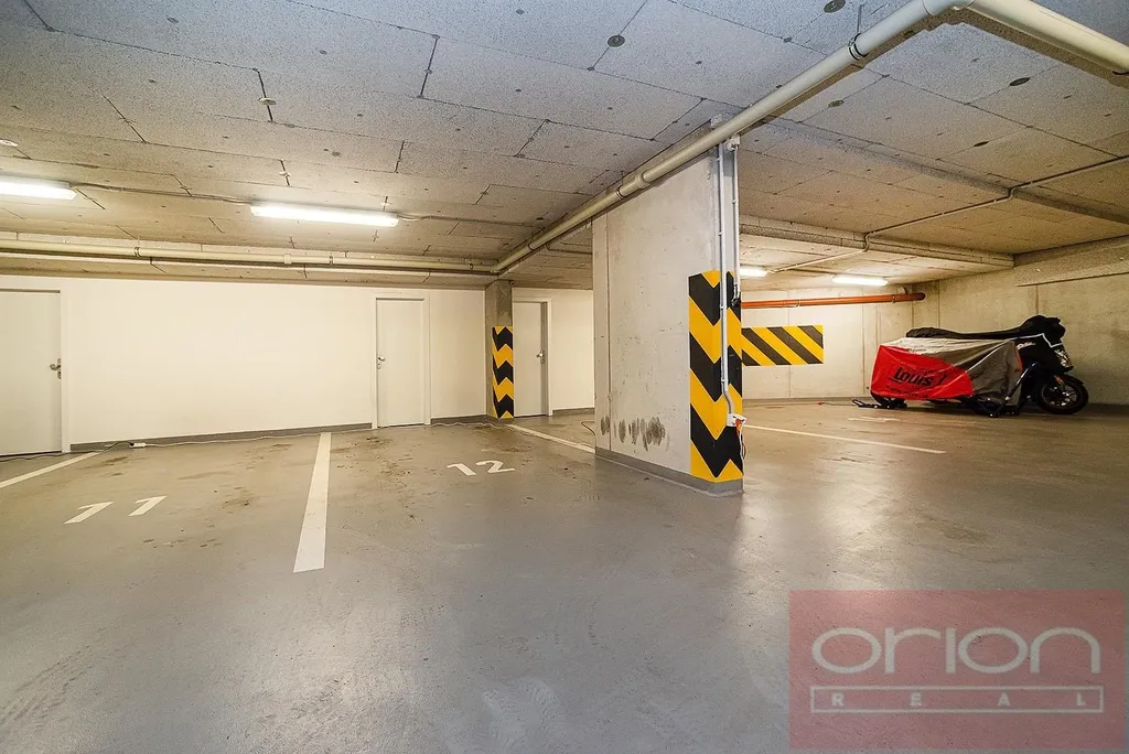 Obě ložnice disponují vestavěnými skříněmi, obývací pokoj je vybaven designovým policovým systémem. Moderní kuchyňská linka je plně vybavena spotřebiči, včetně varné desky Küppersbusch se systémem WOK, lednice s mrazákem, myčky a trouby. Byt má kvalitní dřevěné podlahy a dlažbu, venkovní rolety ve všech místnostech, bezpečnostní dveře a alarm. K bytu náleží jedno garážové stání, jedno venkovní parkovací stání a prostorný sklep.