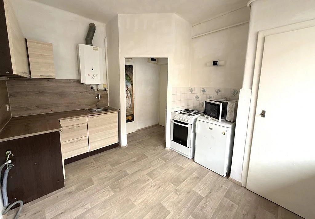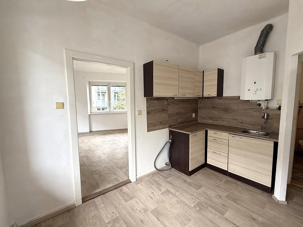 Vstupními dveřmi vejdeme do bytu a ocitneme se v předsíni o výměře cca 1,62 m². Kuchyně o velikosti cca 12,10 m² je vybavena kuchyňskou linkou, lednicí, mikrovlnnou troubou a sporákem. U kuchyňské linky je přívod na pračku. Součástí kuchyně je spíž s regálem, pro úschovu například suchých potravin, spíž má výměru cca 0,66 m². Z kuchyně dále vejdeme do hlavní obytné části o výměře 17,00 m². Jedná se o atypický a moc pěkný pokoj. Koupelna o výměře cca 3,50 m² je spojená s WC. Její součástí je vana, umyvadlo, zrcadlo a plynový ohřívač na teplou vodu.