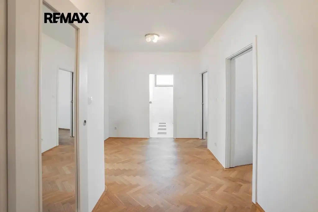 Byt se nachází ve 3. patře domu s výtahem a působí velmi příjemným, vzdušným dojmem. Po vstupu do bytu se nacházíte v prostorné chodbě (11,9 m2). Na jedné straně bytu se nacházejí dva samostatné neprůchozí pokoje o výměrách 13.60 m2 a 13.50 m2, které mohou bez problému sloužit jako ložnice, dětský pokoj nebo pracovna. Nechybí ani šatna o velikosti 3.40 m2, která nabízí vítaný úložný prostor a prakticky může posloužit i pro umístění sušičky na prádlo. Koupelna je spojena s toaletou a její součástí je sprchový kout.