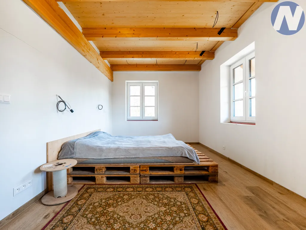 Součástí nabídky je velká garáž pro dva vozy spojená s dílnou, příprava na nabíjení elektromobilu a okolní pozemky o výměře přibližně 2 ha, z poloviny lesní a z poloviny luční. Nechybí ani jezírko, soukromí a krásné přírodní zázemí, které doplňuje i menší otevřený srub v lese, postavený ze dřeva přímo z místního lesa. Dle územního plánu je zde navíc možnost výstavby druhé budovy, takže nemovitost může dávat smysl jak pro vlastní bydlení, tak i pro podnikatelské využití.