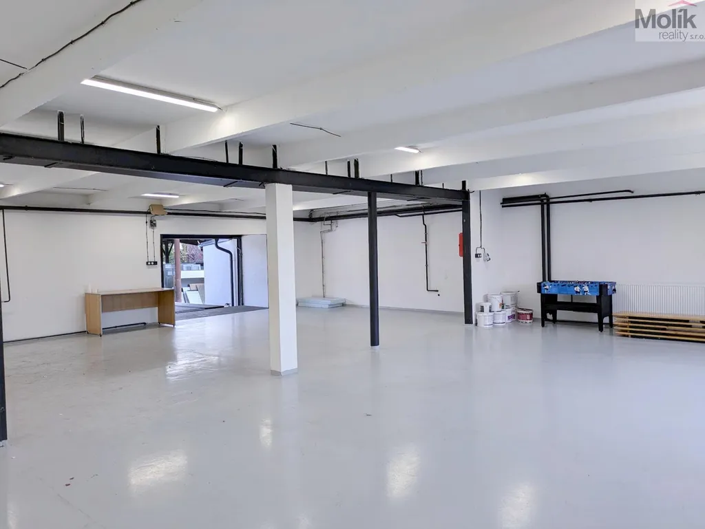 Prostory se nachází ve zvýšeném přízemí (1.NP) a jsou vhodné například na skladování materiálu či výrobu. Uskladnění těžších materiálů je možné zajistit vysokozdvižným vozíkem, který je k dispozici v areálu po domluvě s majitelem. Prostory jsou vytápěné kamny na pelety a tuhá paliva. Součástí pronájmu je místnost o velikosti 10 m2, která může sloužit jako kancelář, šatna, nebo kuchyňka a soukromá umývárna s WC.