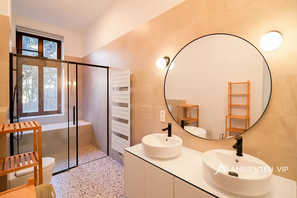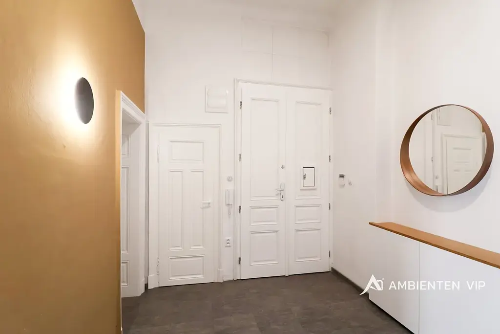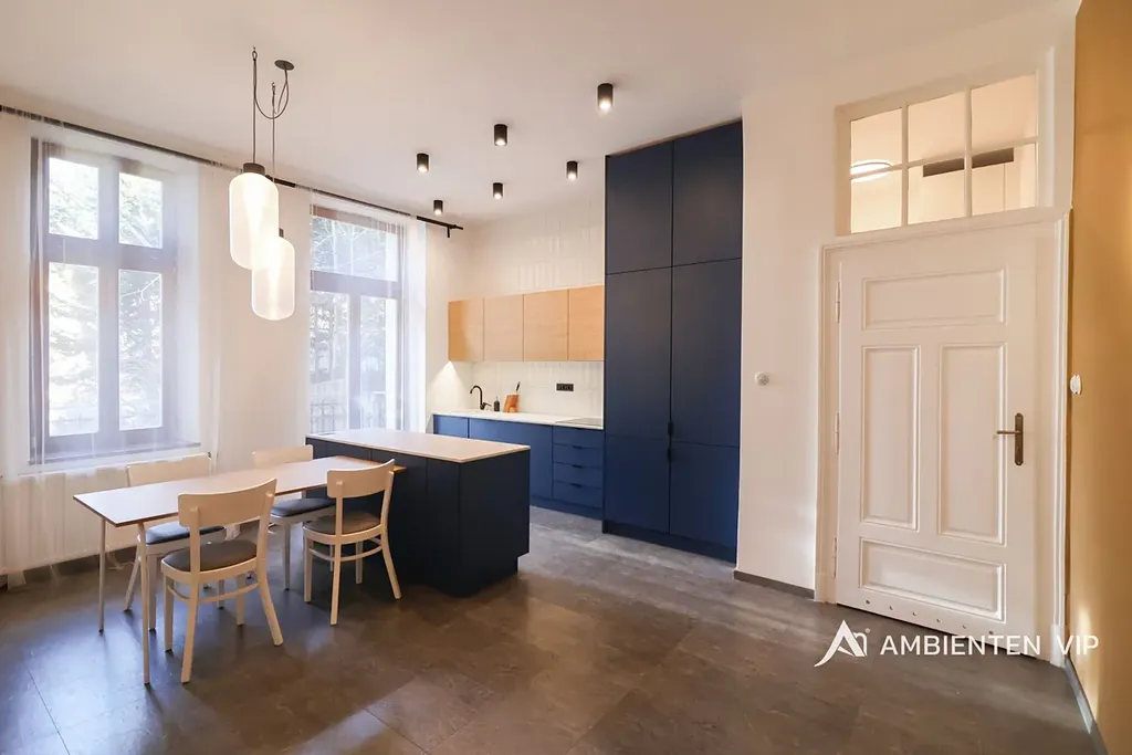Byt o celkové podlahové ploše 143,49 m² se nachází v 2. nadzemním podlaží a nabízí velmi prostorné místnosti s vysokými stropy, které dodávají interiéru vzdušnost a reprezentativní charakter. Celý prostor zároveň nese jedinečný genius loci tohoto domu. Prostory bytu jsou kompletně zařízené a připravené k okamžitému nastěhování.