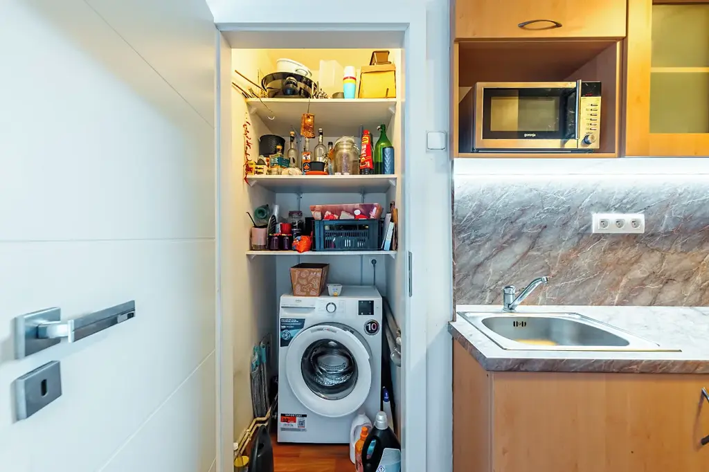 V bytě se nachází velká předsíň s oknem (věšáková stěna, botník), koupelna (vana se sprchovací zástěnou, umyvadlo, otopný žebřík), samostatné WC s oknem, prostorný obývací pokoj (sedačka, skříňky, stolek), kuchyň s jídelním koutem (vestavěné skříně, plyn. sporák s el. troubou, digestoř, lednice s mražákem, stůl a 4 židle), spíž (s pračkou), ložnice (vestavěná skříň, manželská postel, prac.stůl + židle).