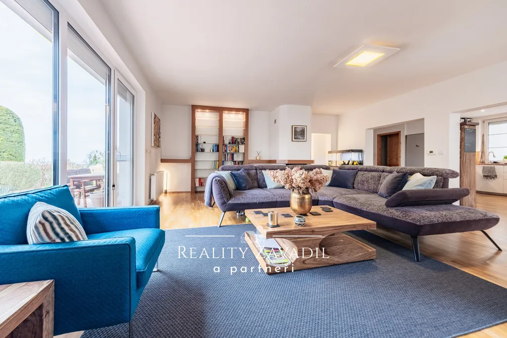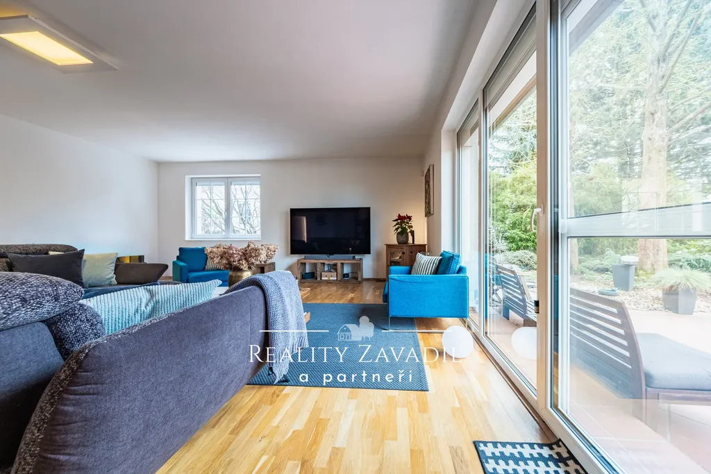 Dominantou přízemí je velkorysý obývací pokoj (43 m²) s krbem, na něj navazuje plně vybavená moderní kuchyň a světlá jídelna a komora. Dále se zde nachází pokoj pro hosty (21 m²), možno využít i jako hlavní ložnici, s vestavěnými skříněmi, koupelna se sprchovým koutem a toaletou a praktická technická místnost.