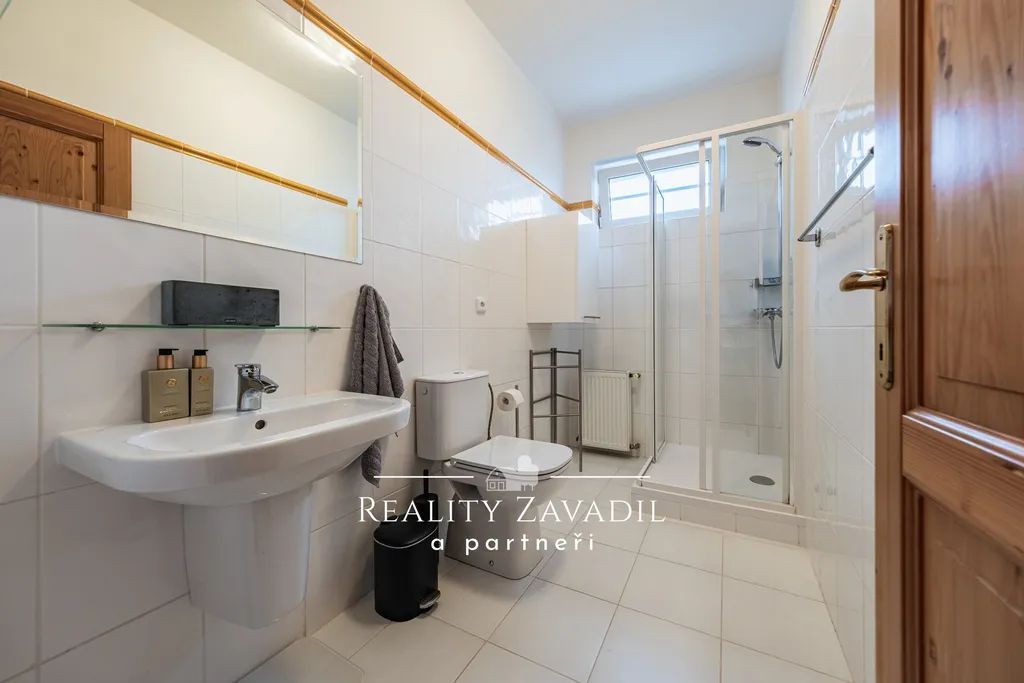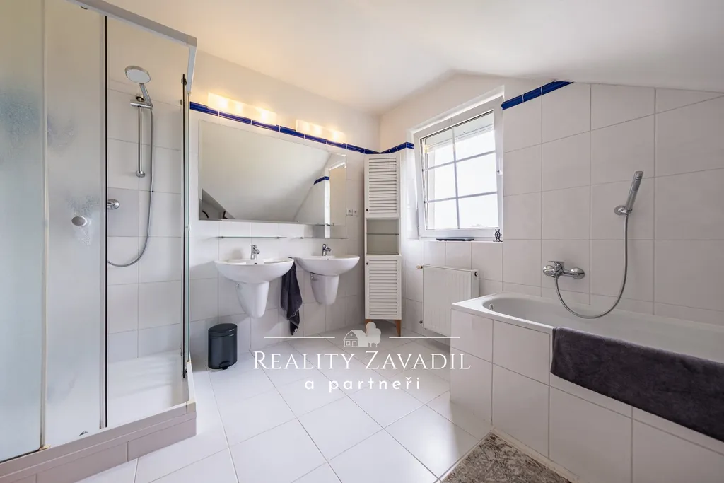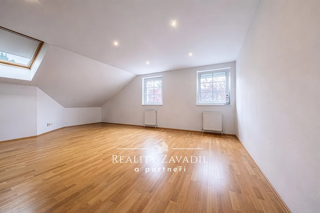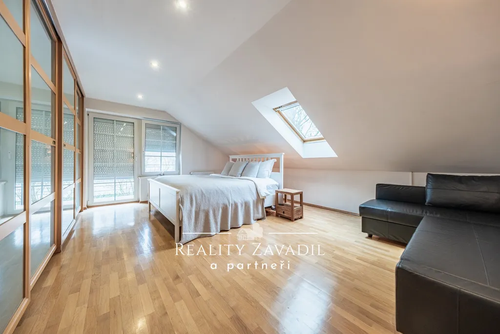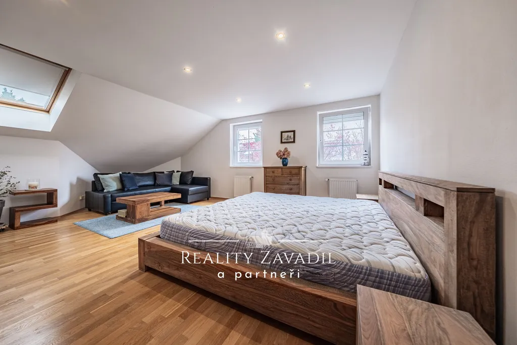 V horním podlaží jsou tři prostorné ložnice - dvě ideální jako dětské pokoje či pracovny (22 a 30 m²) a hlavní ložnice (27 m²) s balkonem a vestavěnými skříněmi. Dále zde najdete velkorysou podkrovní místnost (43 m²), kterou lze využít jako hernu pro děti, domácí kancelář nebo další ložnici. Samozřejmostí je hlavní koupelna s vanou i sprchovým koutem a samostatná toaleta.