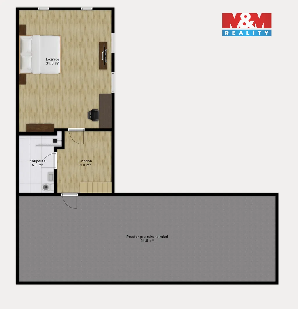 Dispozici tvoří přízemí s prosklenou předsíní, třemi pokoji, dvěma koupelnami se sprchovým koutem, toaletou a kuchyní. V podkroví se nachází jeden pokoj, koupelna se sprchovým koutem, záchodem a vstupem do nedokončené části podkroví, kterou si můžete upravit podle svých představ.