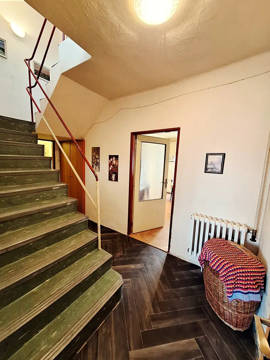V patře je další pokoj, průchozí do podkrovní ložnice. Také dva půdní prostory a terasa.
