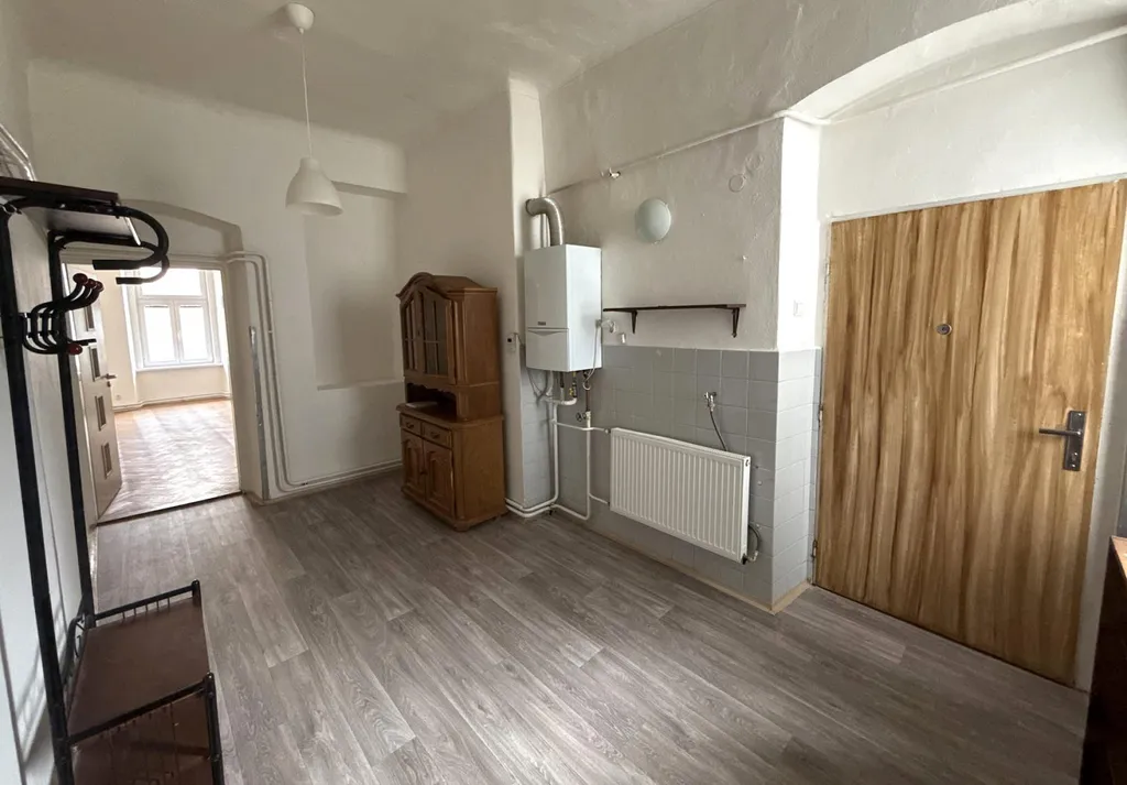 Dveřmi vejdeme do vstupní haly bytu, která vzhledem ke své velikosti a umístění může stejně jako původním nájemcům sloužit jako vstupní hala spolu s obývacím pokojem. Celková plocha této místnosti je cca 15,65 m and sup2;. Tato místnost je vybavena menší částečně prosklenou skříní, je zde umístěn plynový kotel, který zajišťuje vytápění bytu. Naproti vstupním dveřím se nachází šatna o velikosti cca 3,40 m and sup2; s praktickým regálovým systémem. Kuchyně je samostatná, její výměra činí cca 9,38 m and sup2;. je vybavena kuchyňskou linkou, kombinovaným sporákem, lednicí a jídelním stolem se židlemi. Z kuchyně je vstup do menší chodby o výměře cca 1,34 m and sup2;, ze které je přístup na samostatnou toaletu o výměře cca 1,20 m and sup2; a do koupelny o velikosti cca 5,55 m and sup2;. V koupelně je vana, umyvadlo, zrcadlová skříňka, koupelnová skříňka, pračka a bojler pro ohřev vody. Z hlavní haly je vstup do dvou průchozích pokojů, jednoho o výměře cca 13,06 m and sup2;, a druhého o výměře cca 25,09 m and sup2;. V obou pokojích jsou položeny parkety.