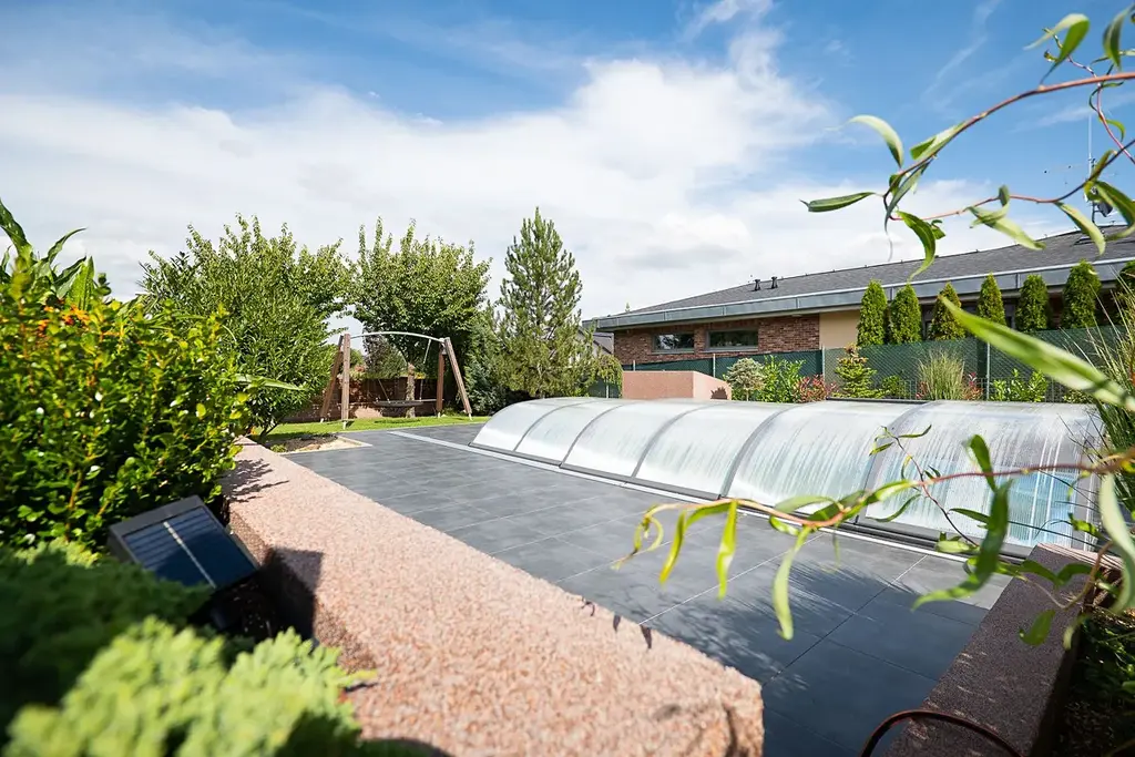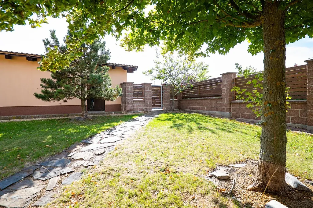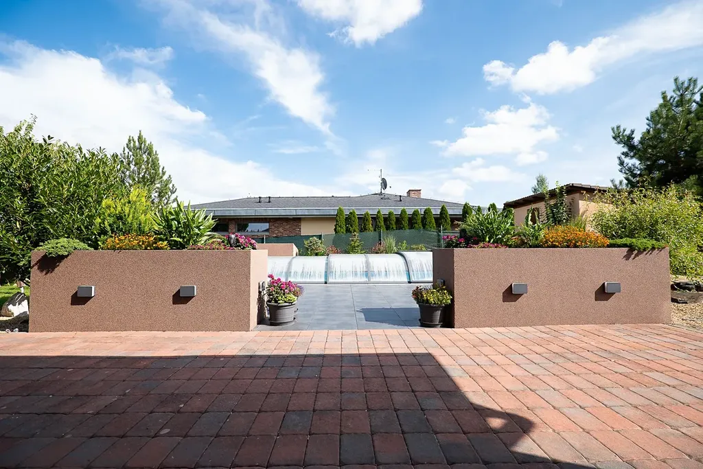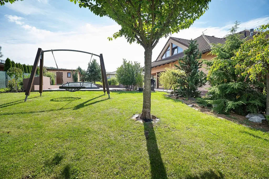 Okrasná zahrada s upravenou zelení a zahradním domkem nabízí dostatek prostoru pro relax i rodinná setkání. Večer si můžete užít posezení u ohně, přes den zase slunnou terasu nebo bazén.