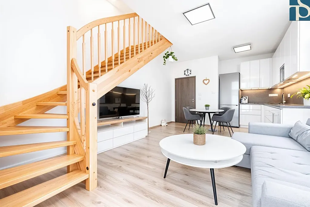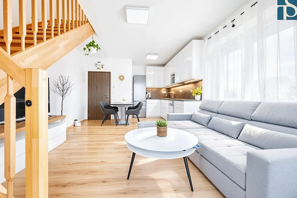 Byt má podlahovou plochu 77,8 m2 a je řešený ve dvou podlažích, což mu dodává příjemnou vzdušnost a přirozené oddělení denní a klidové části. Dispozice je praktická a promyšlená (viz přiložené dispoziční schéma), ideální jak pro pár, tak pro rodinu.
