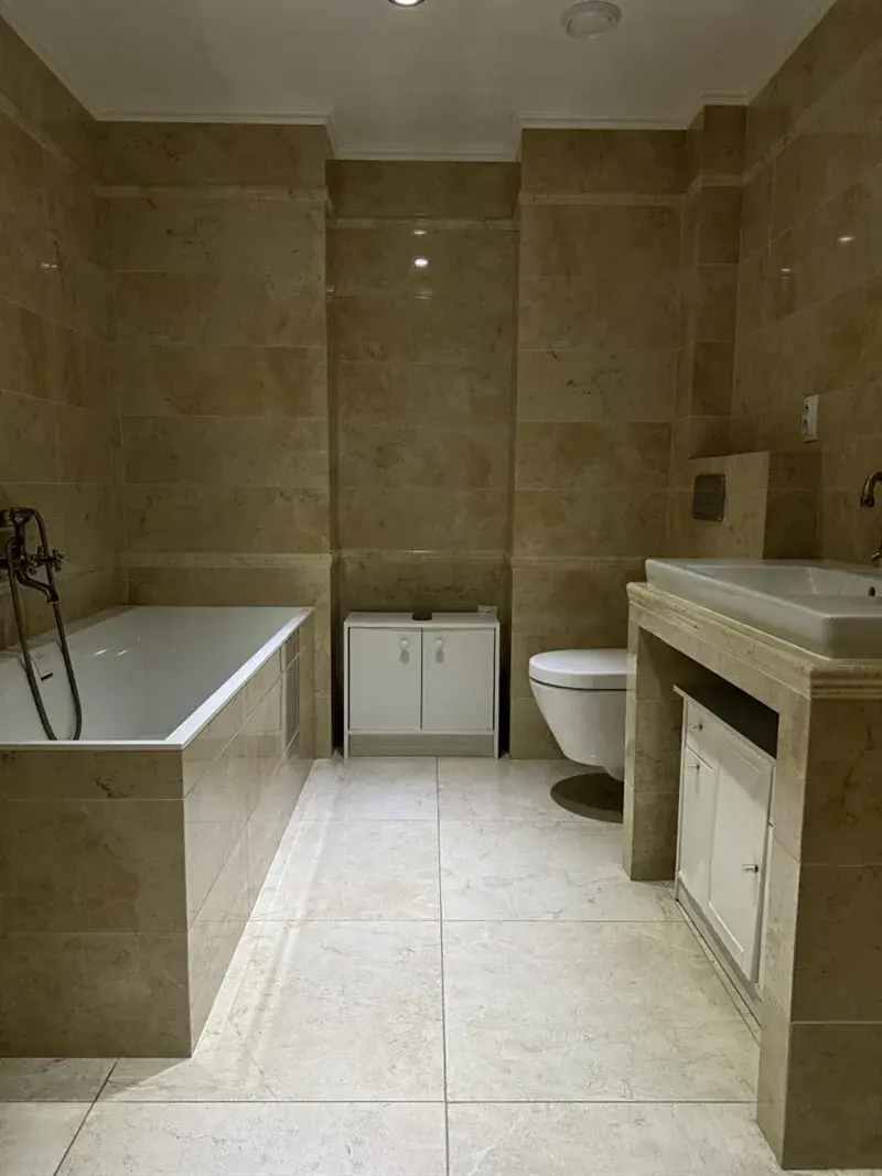 Koupelna je řešena s důrazem na funkčnost i estetiku, disponuje vanou, toaletou a čistým moderním designem. Celkový dojem z bytu podtrhuje kombinace kvalitních materiálů a promyšleného řešení každého detailu. Byt je částečně vybaven nábytkem (kombinace sériového a zakázkového) s možností dohody o jeho ponechání či kompletním vyklizení dle preferencí nového majitele.
