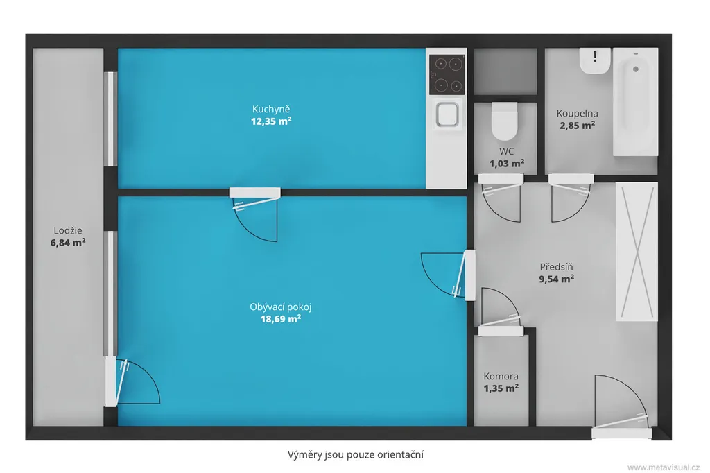 Celková užitná výměra bytu činí 53 m². Podlahová výměra je 46 m² + lodžie o výměře 7 m². K bytu náleží sklepní kóje.