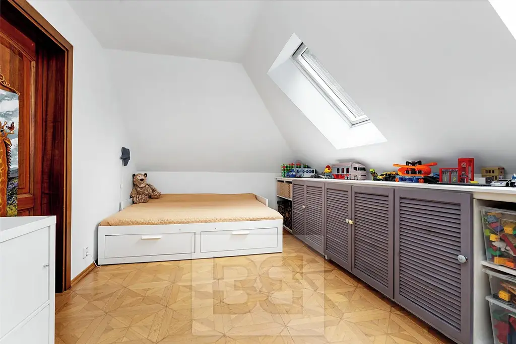 V patře domu najdete čtyři ložnice, které poskytnou dostatek soukromí všem členům rodiny. Nechybí ani druhá koupelna. Jedna z ložnic má vlastní WC a vstup na balkon (8 m²) s krásným výhledem do zahrady a okolní přírodu. Uprostřed chodby je vstup na půdu, vhodná pro uložení sezónních věcí.