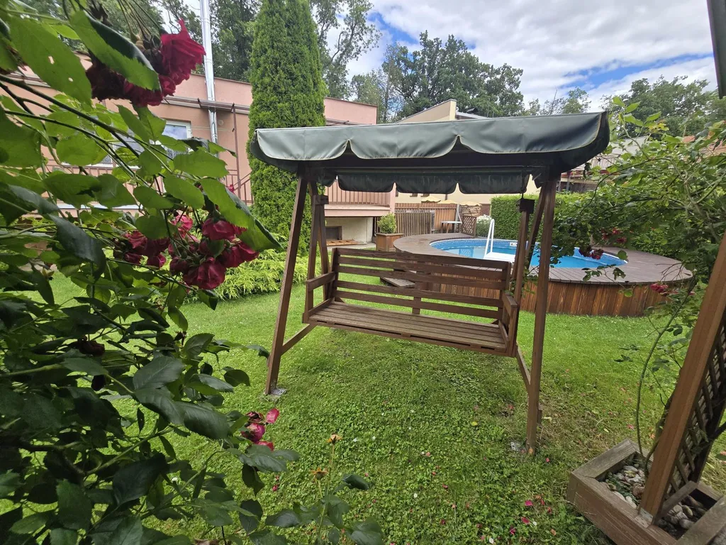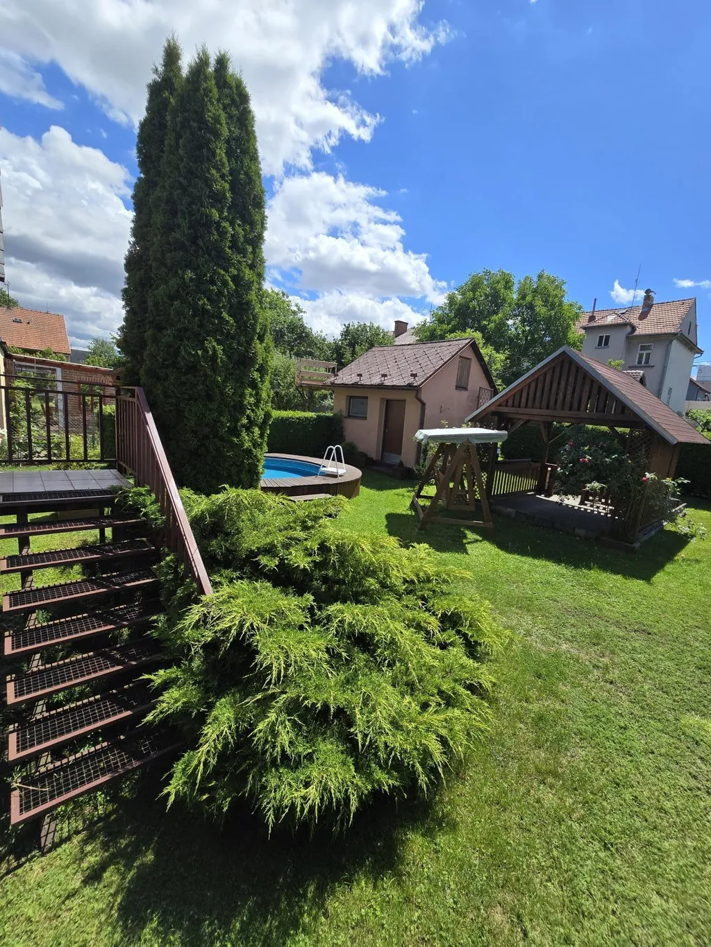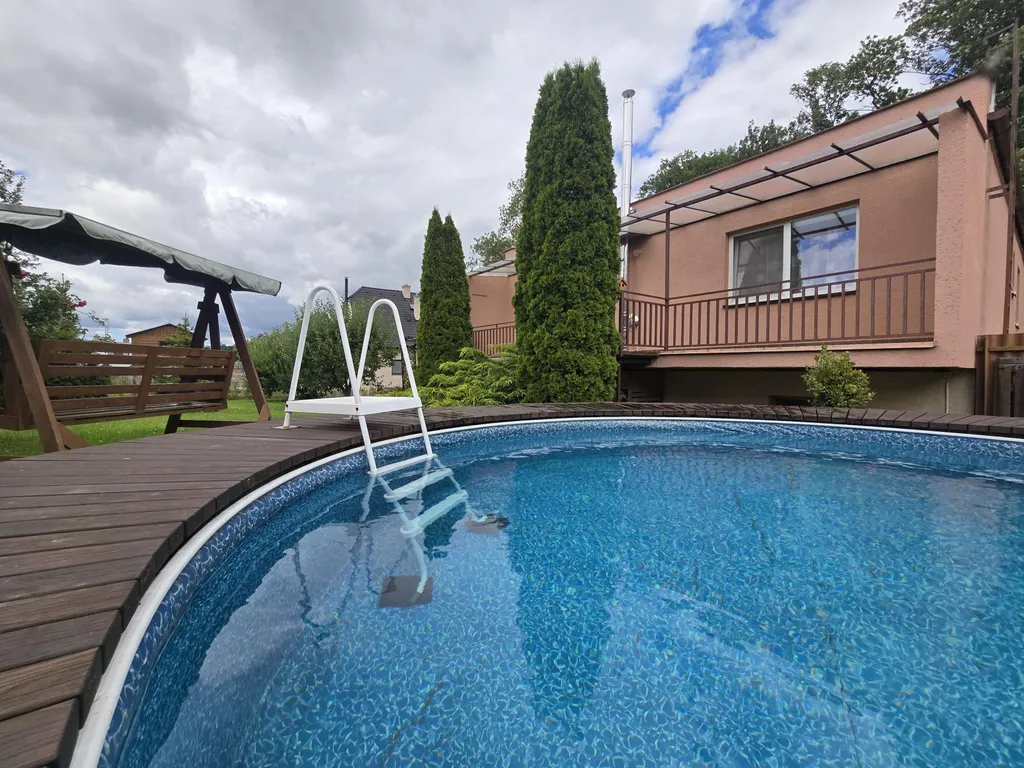 V obývacím pokoji je vstup přes velký balkón na zahradu na které je zahradní domek (16m2), pergola a bazén z roku 2020.