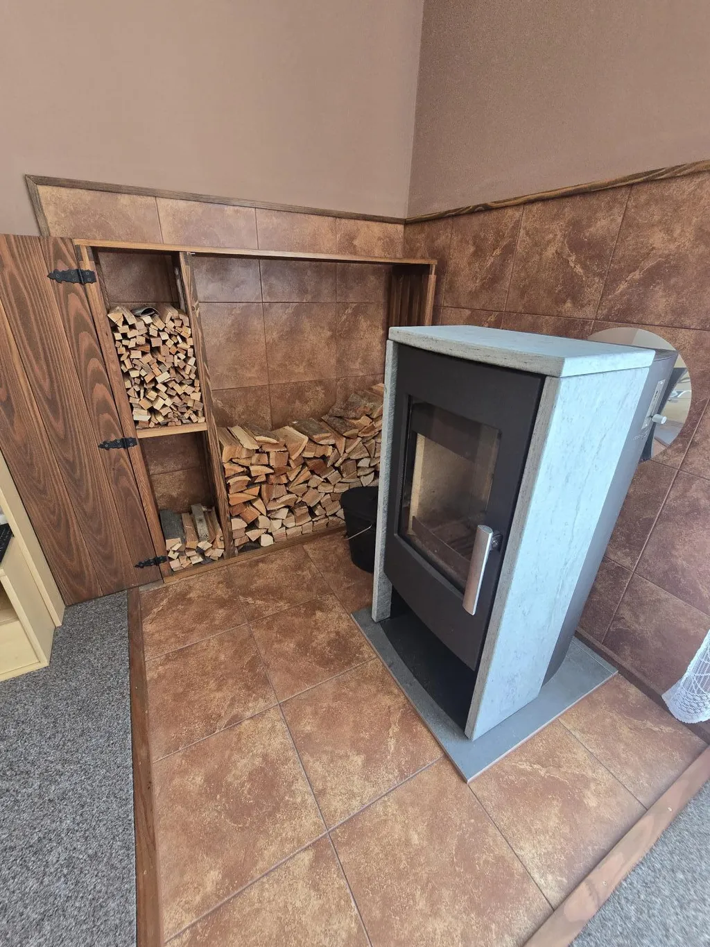Vytápění v domě je plynové, nebo na tuhá paliva v krbu z roku 2022.